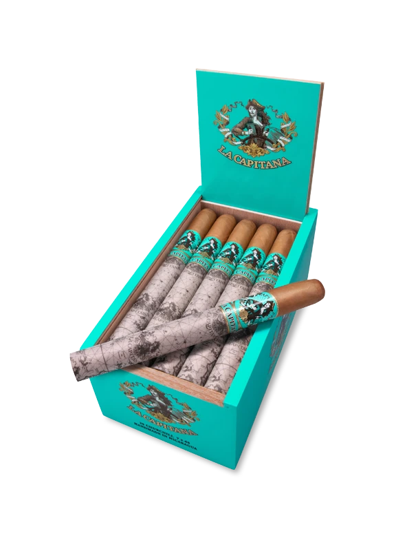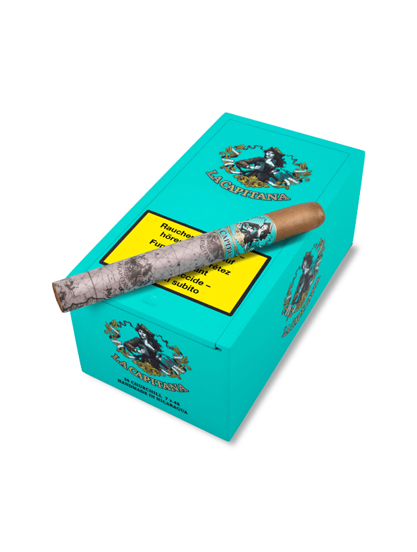Zigarrenfans betreten den Hafen einer neuen Legende: LA CAPITANA steht stolz in ihrem Schiffsbug, bereit die Welt zu erobern. Am Kopf der Zigarre ist das seidig-matte Deckblatt direkt zu erkennen. Danach übernimmt der türkisfarbene Ring mit der Kapitänin das Ruder. Ein bedrucktes Seidenpapier verhüllt den Rest der Zigarre und verleiht ihr so ihr perfektes Äusseres. Eine Landkarte mit Schiffsrouten über den Atlantik erzählen die aufregende Geschichte dieser Zigarre. LA CAPITANA erzählt eine Geschichte von sorgfältiger Tabak-Auswahl, eleganter Geschmackskomposition und handwerklicher Präzision. Sie eint Amerika und Europa, Tradition und Moderne. Komponiert von den besten Rollerinnen und Rollern in einer der modernsten Manufakturen Nicaraguas, steht sie für milden, vielschichtigen Genuss.
